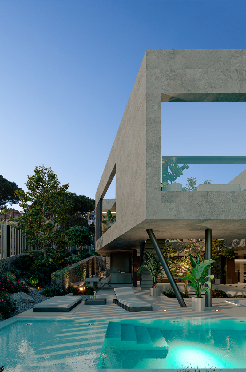 Arquitectura fluida, materiales nobles y espacios equilibrados.